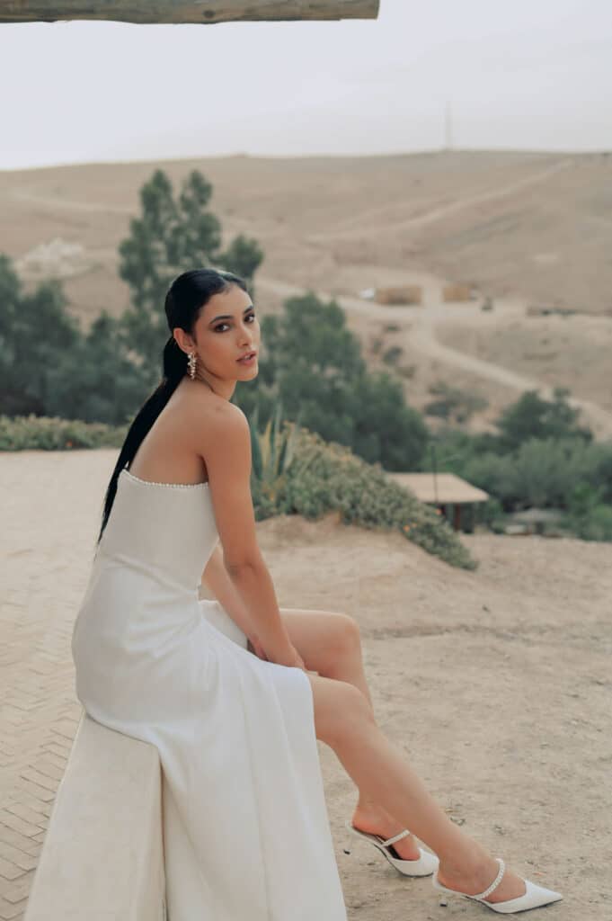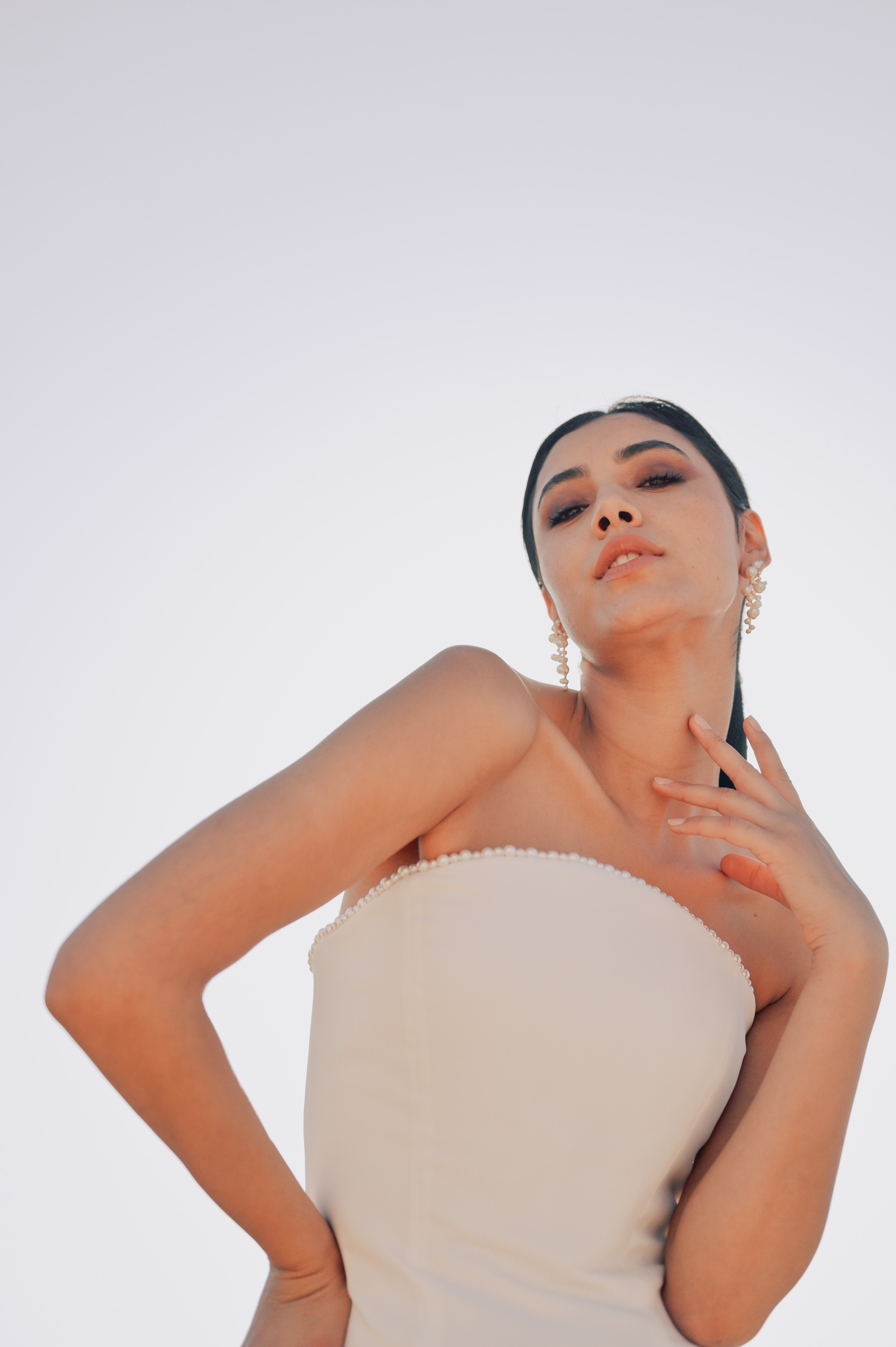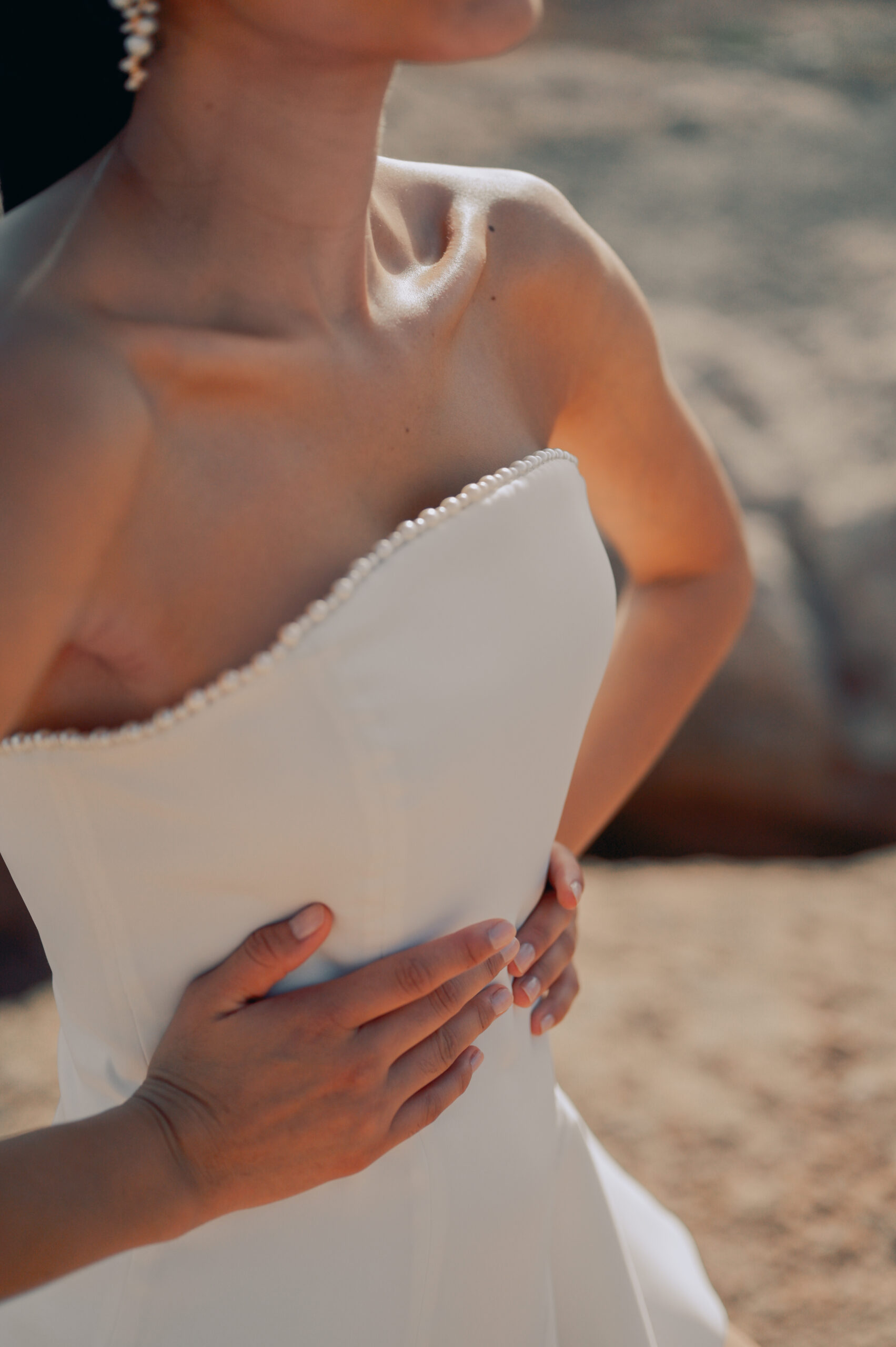 La robe Nazaré incarne la modernité avec une touche de raffinement. Son décolleté, audacieux et élégant, rappelle la forme délicate d’un coquillage. Des perles en nacre soulignent subtilement ce décolleté. La robe se distingue par sa fente en volants, une allusion poétique à la danse des vagues. À première vue, Nazaré semble d’une simplicité apparente, mais elle révèle, au fil des regards, une richesse de subtilités qui la rendent unique. Elle est la parfaite alliance entre élégance contemporaine et inspiration marine.